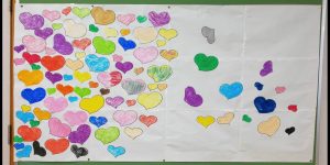 周囲に黄色のおはながみを、木のみきも、茶色のおはながみをちぎってはり、