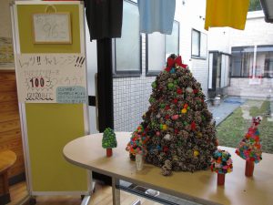 ![]() メインツリーは昨年の力作。まつぼっくりでできています。 |